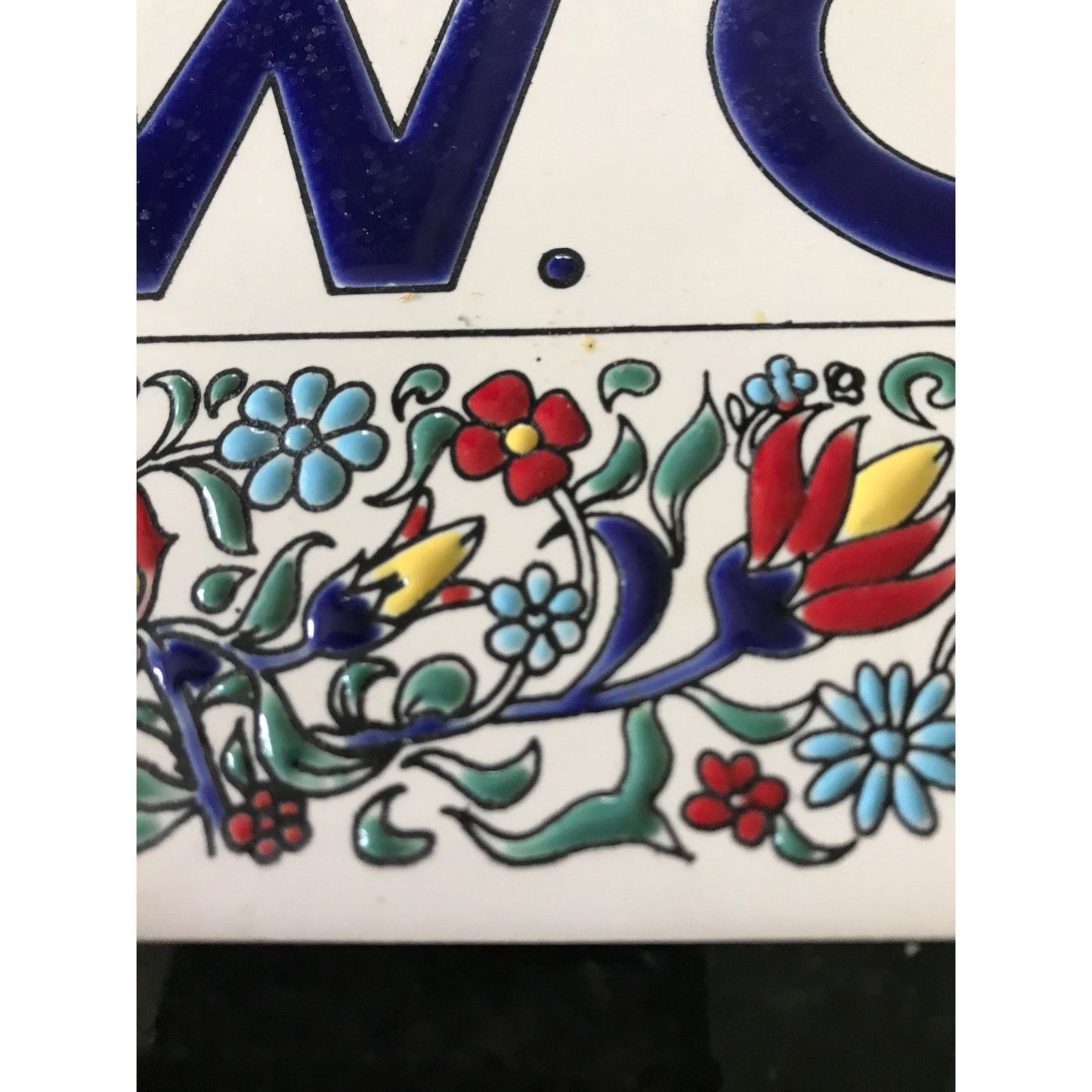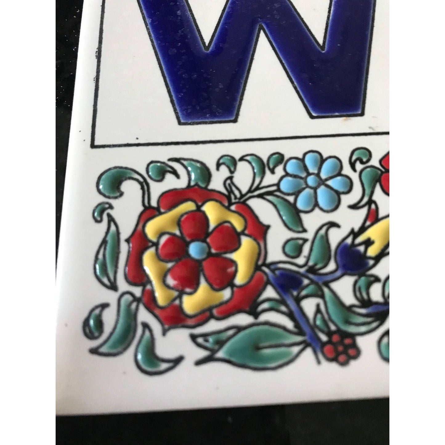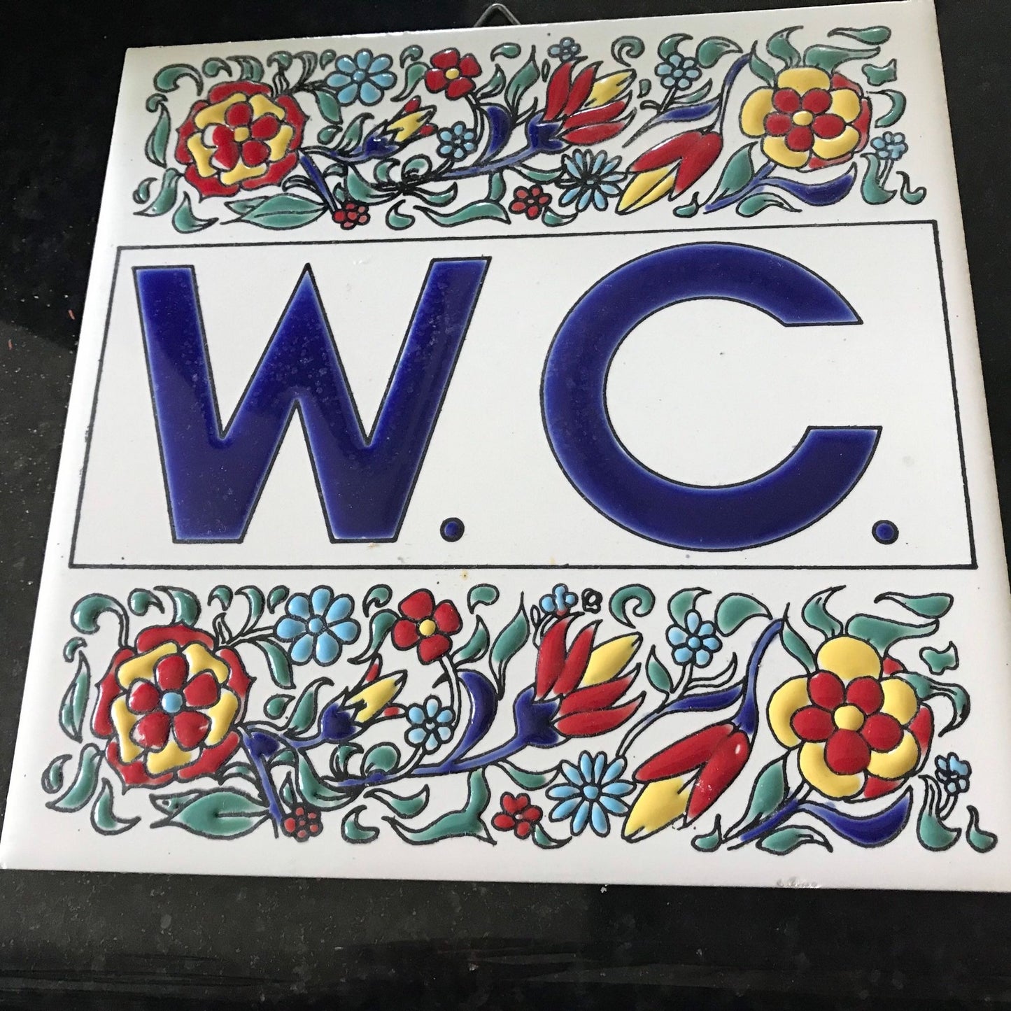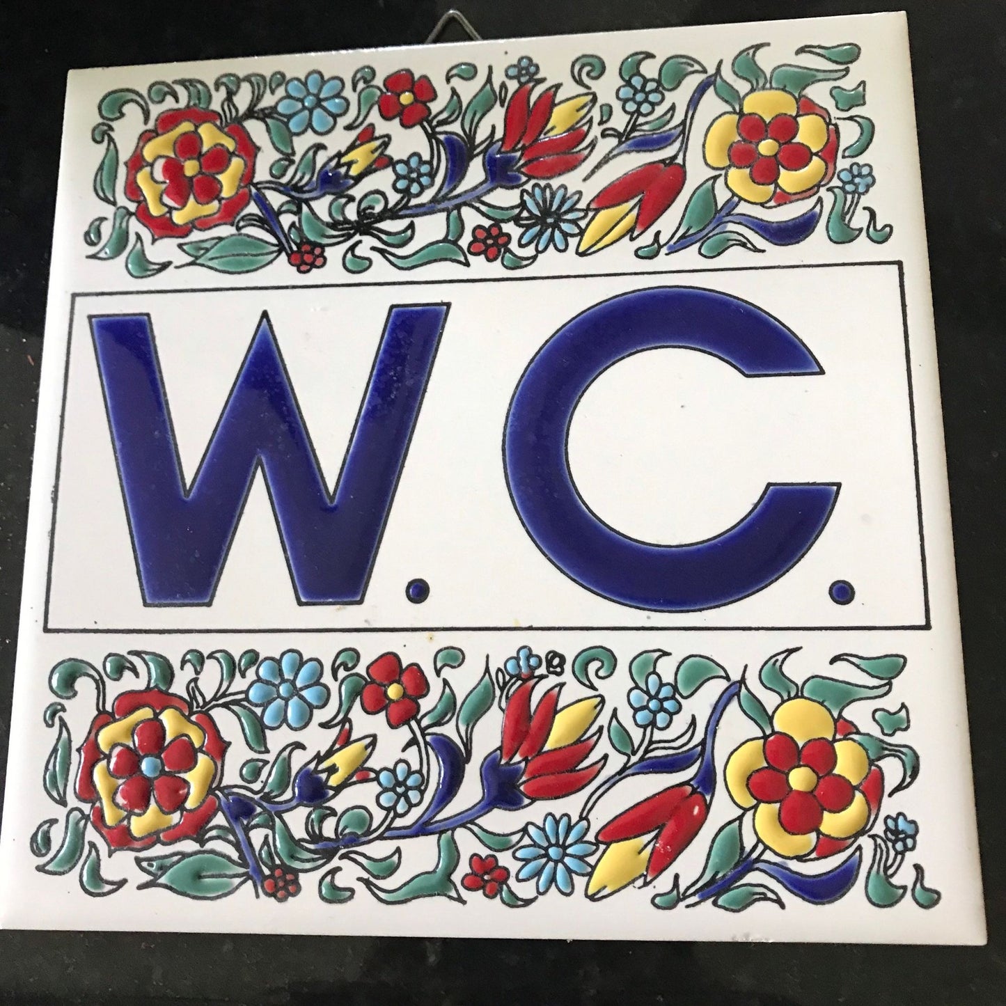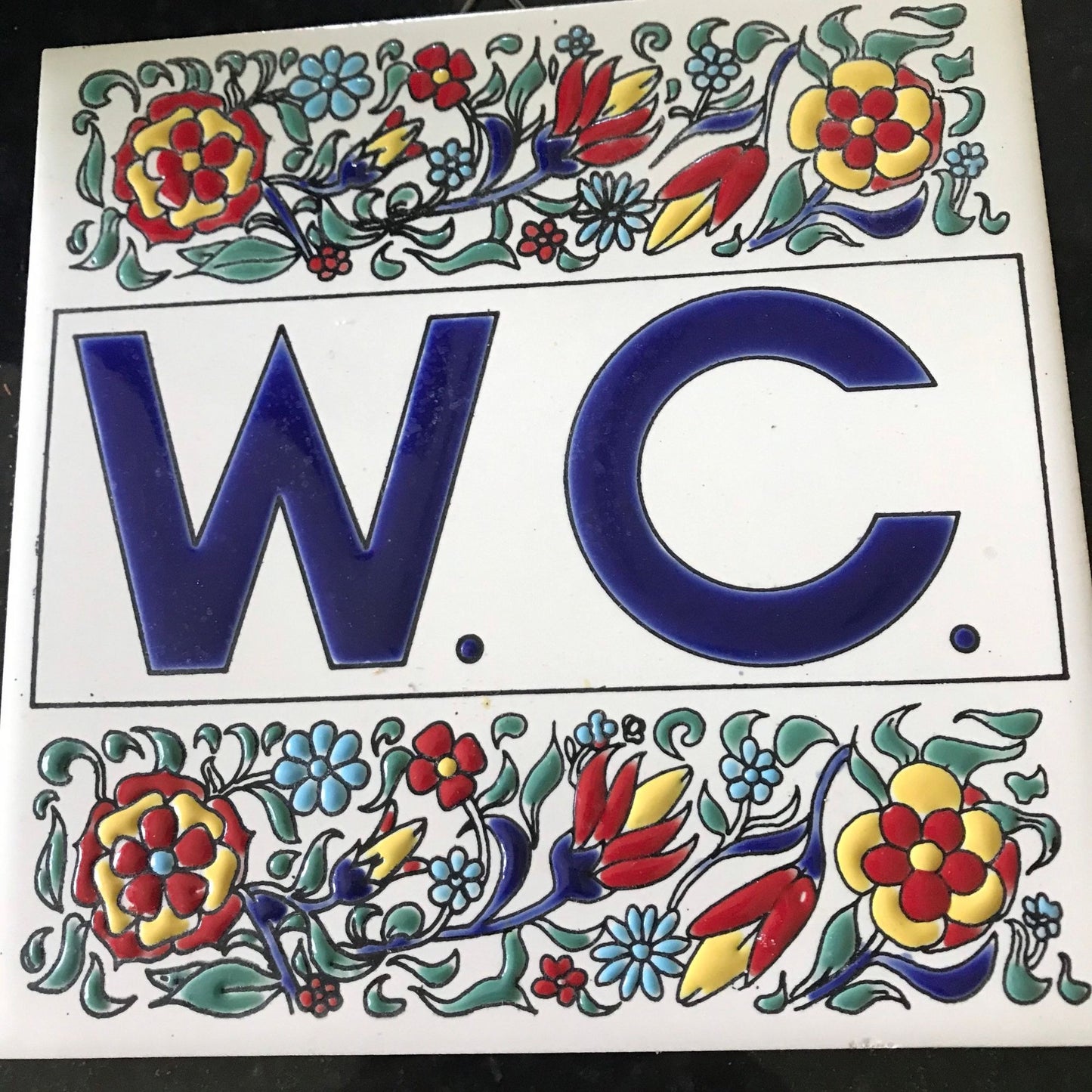 Vintage 1970's Philkeram Johnson Handmade Tile 6" x 6" Made In Greece W. C. (Water Closet) Floral Design