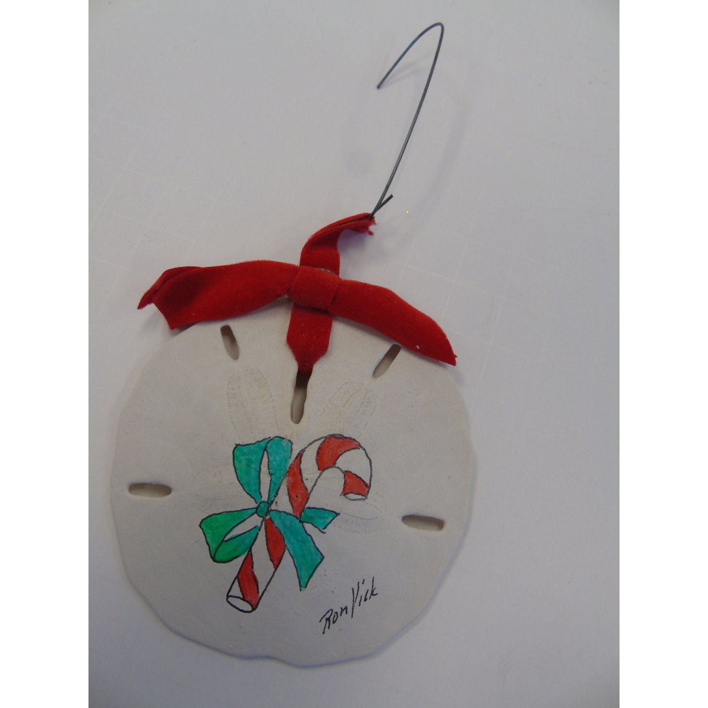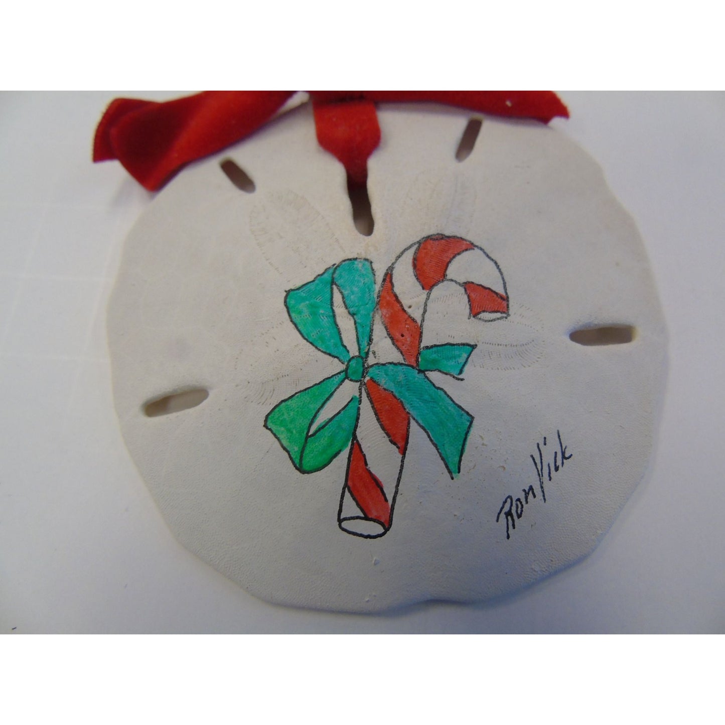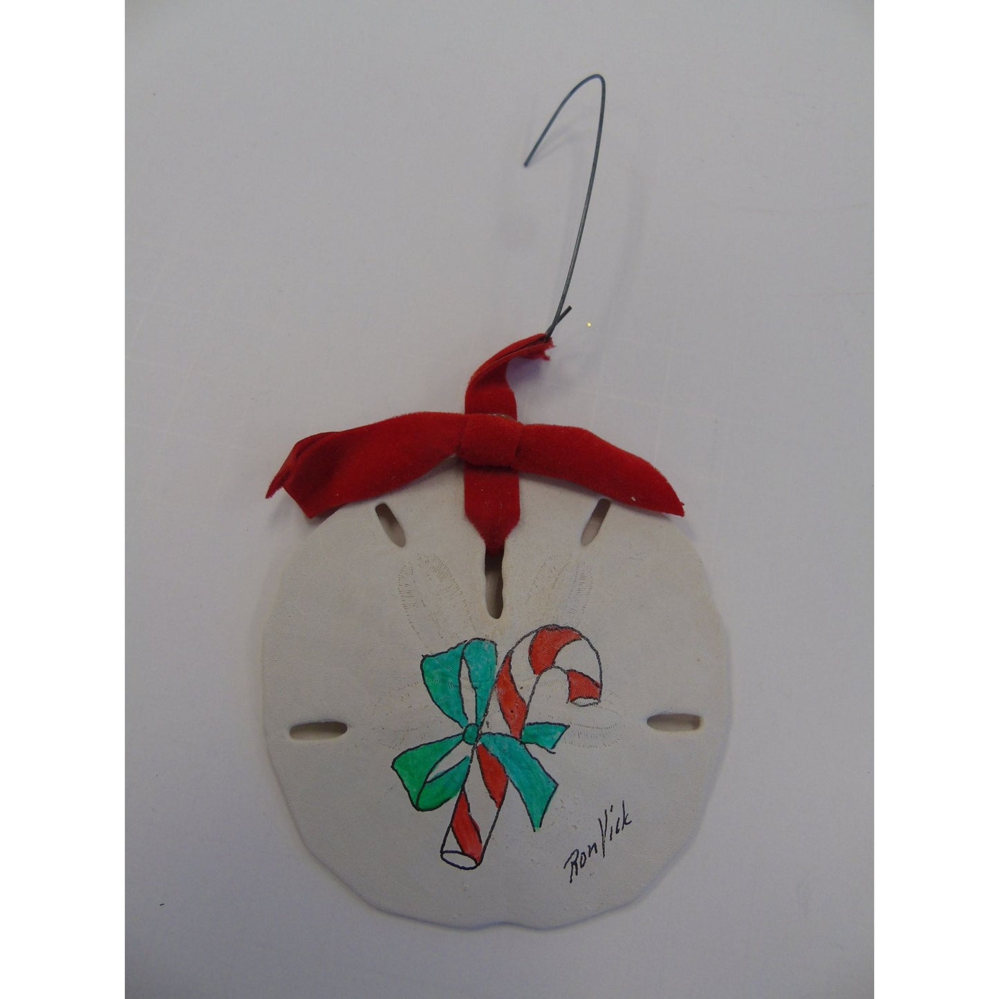 Vintage 1970's Ron Vick Christmas Candy Cane Sand Dollar Ornament Hand Painted & Signed By The Artist