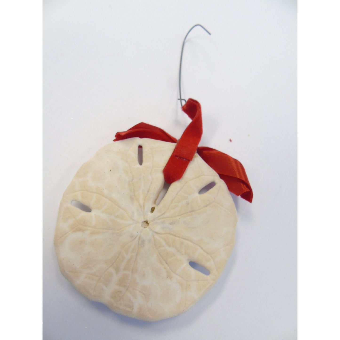 Charming, one of a kind, hand painted candy cane on a sand dollar with a red velvet ribbon and metal hanger.