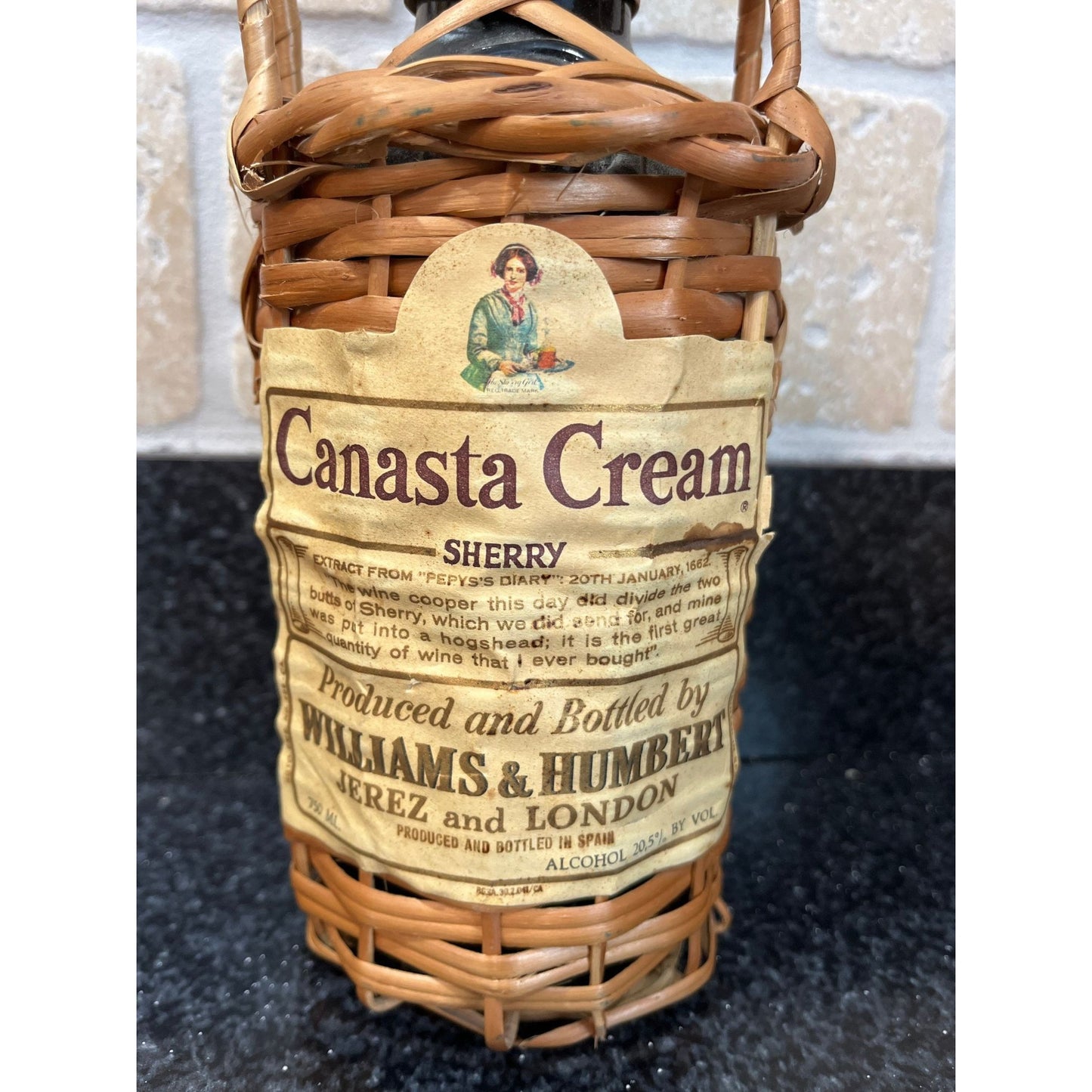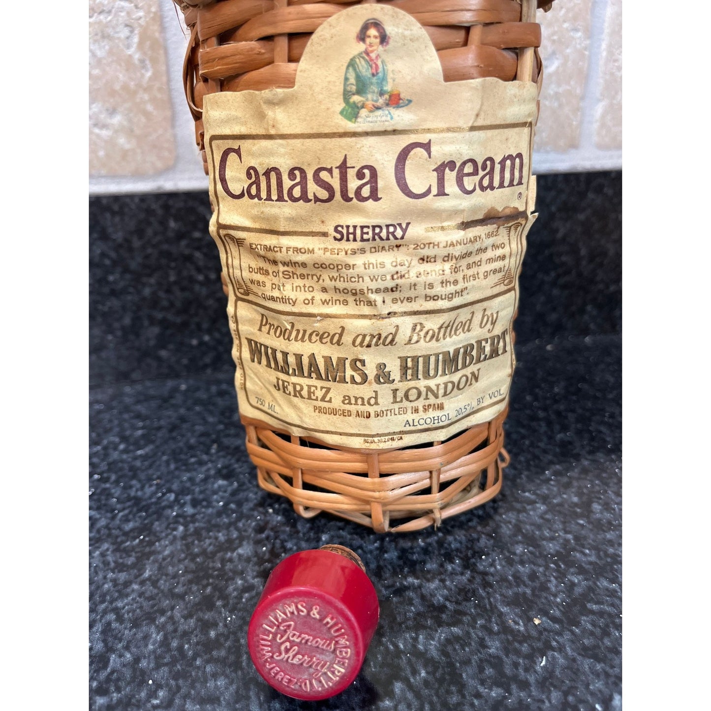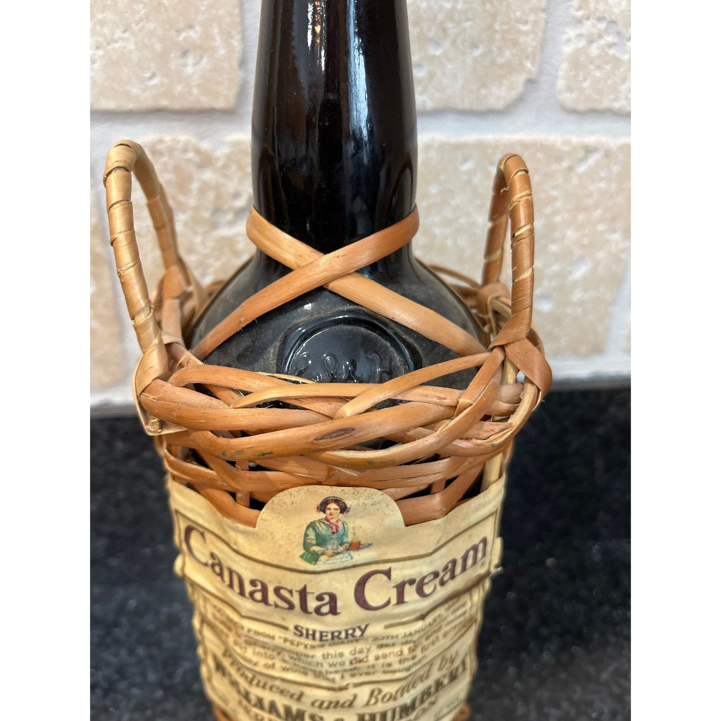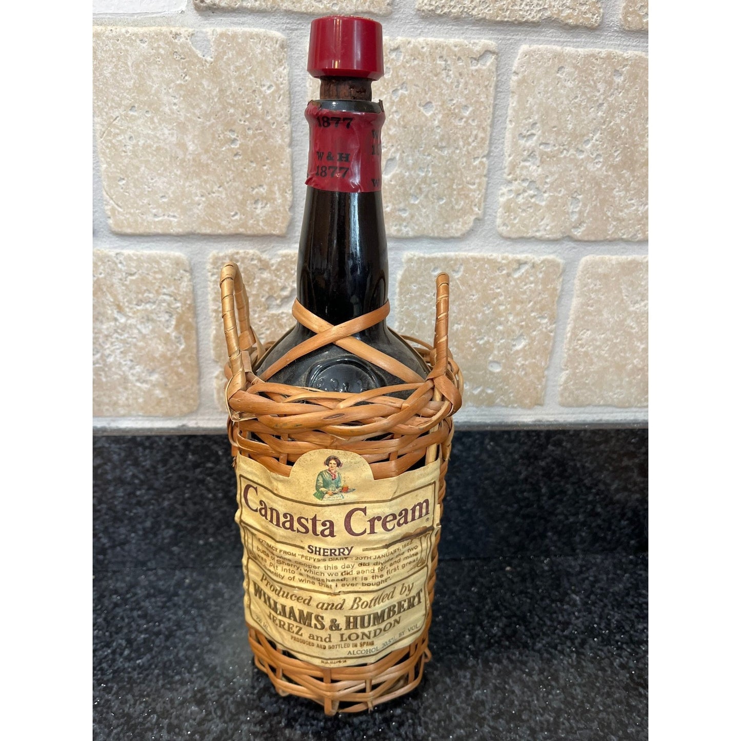 Vtg 1960's Canasta Cream Sherry Bottle In A Handmade Carrying Basket Williams & Humbert Jerez and London Empty