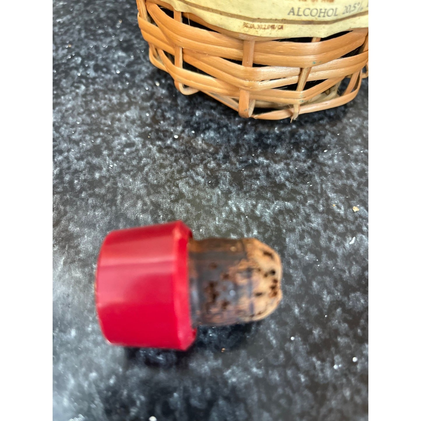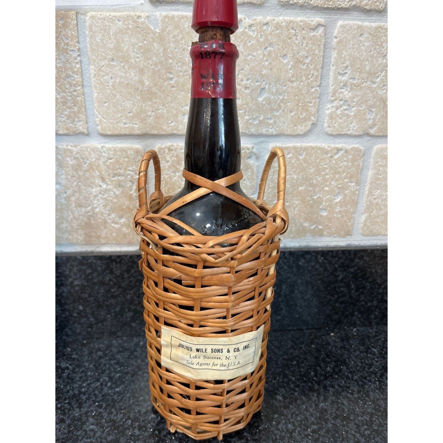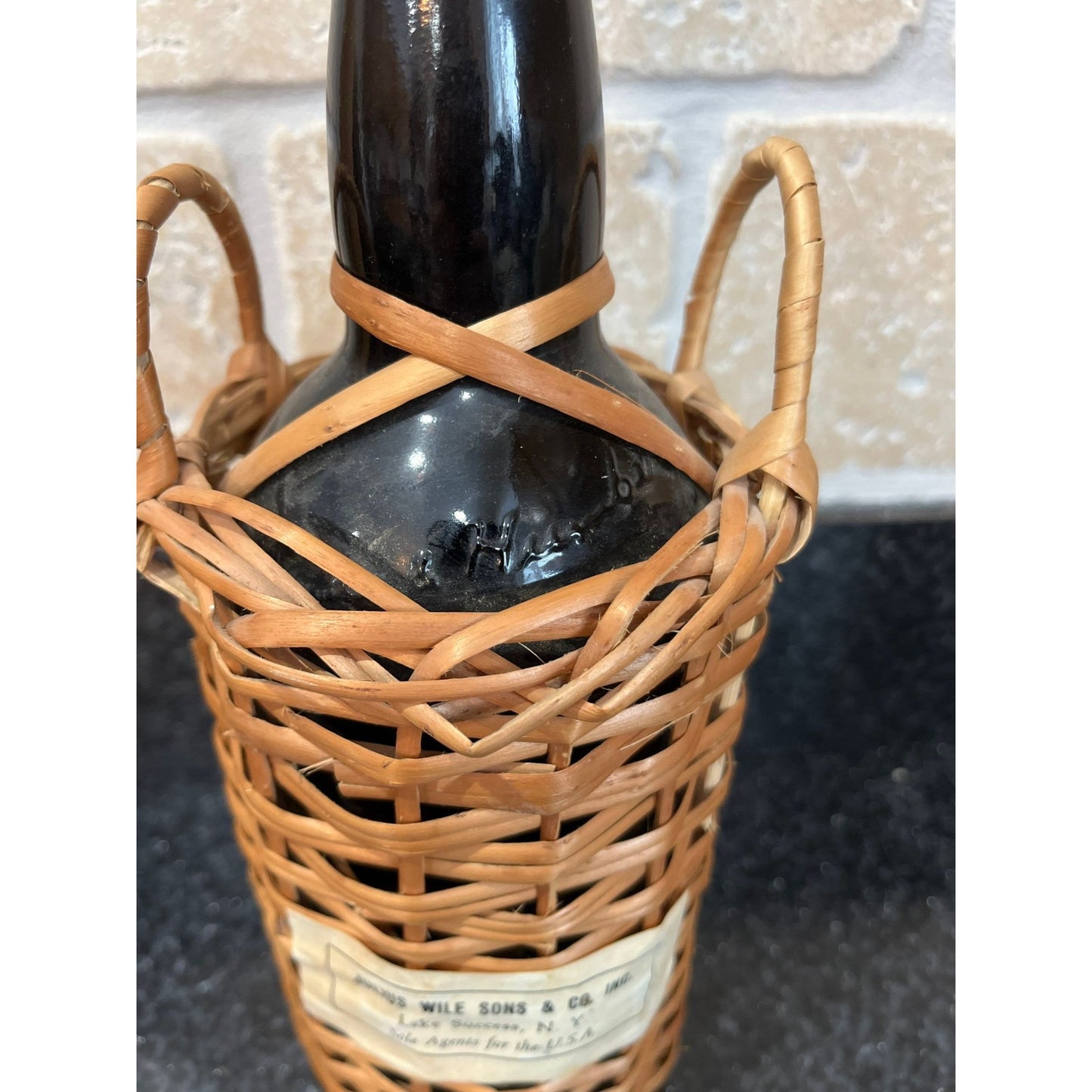 The 1960's bottle was hand woven into the wicker carrying basket. Totally intact with the original labels, cork and embossed bottle.