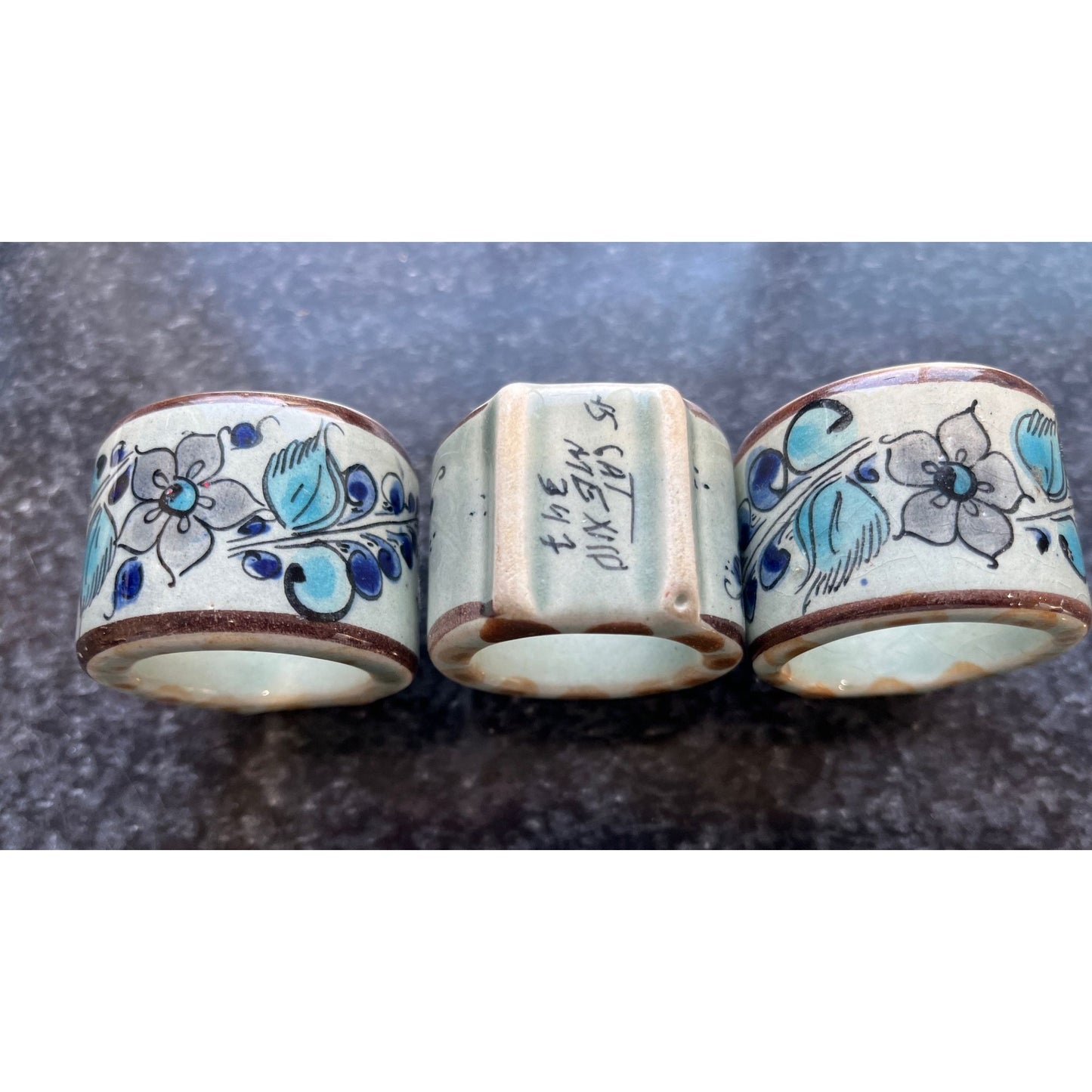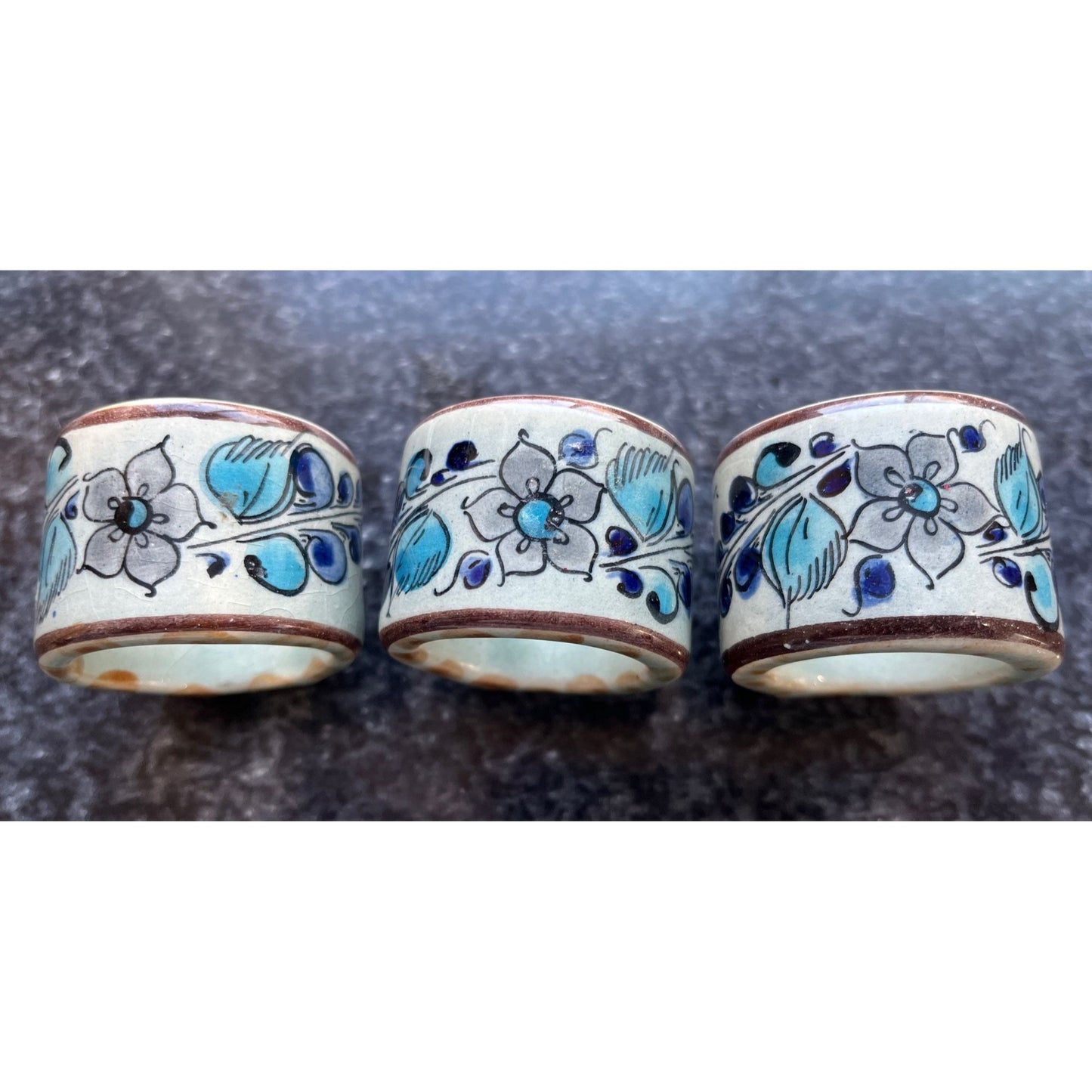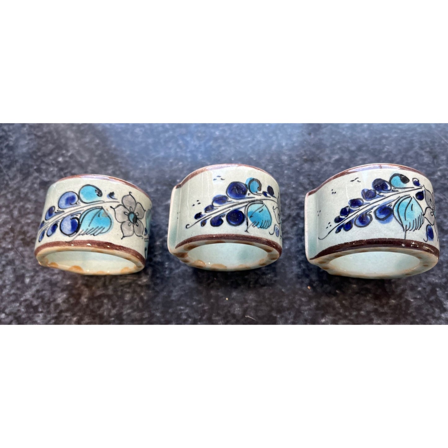 Vtg Three 15 CAT MEX Mexico Ceramic Handmade Napkin Rings 347 Meant To Stand Up Intricate Floral Design Blues Gray Brown