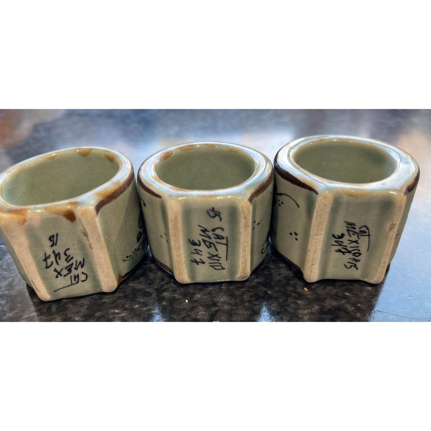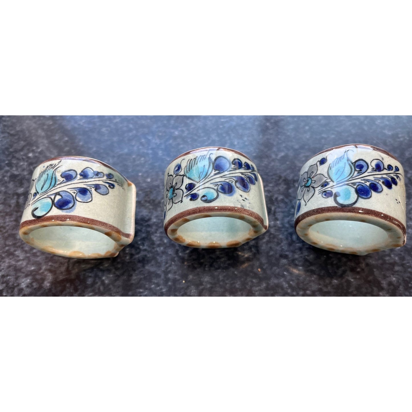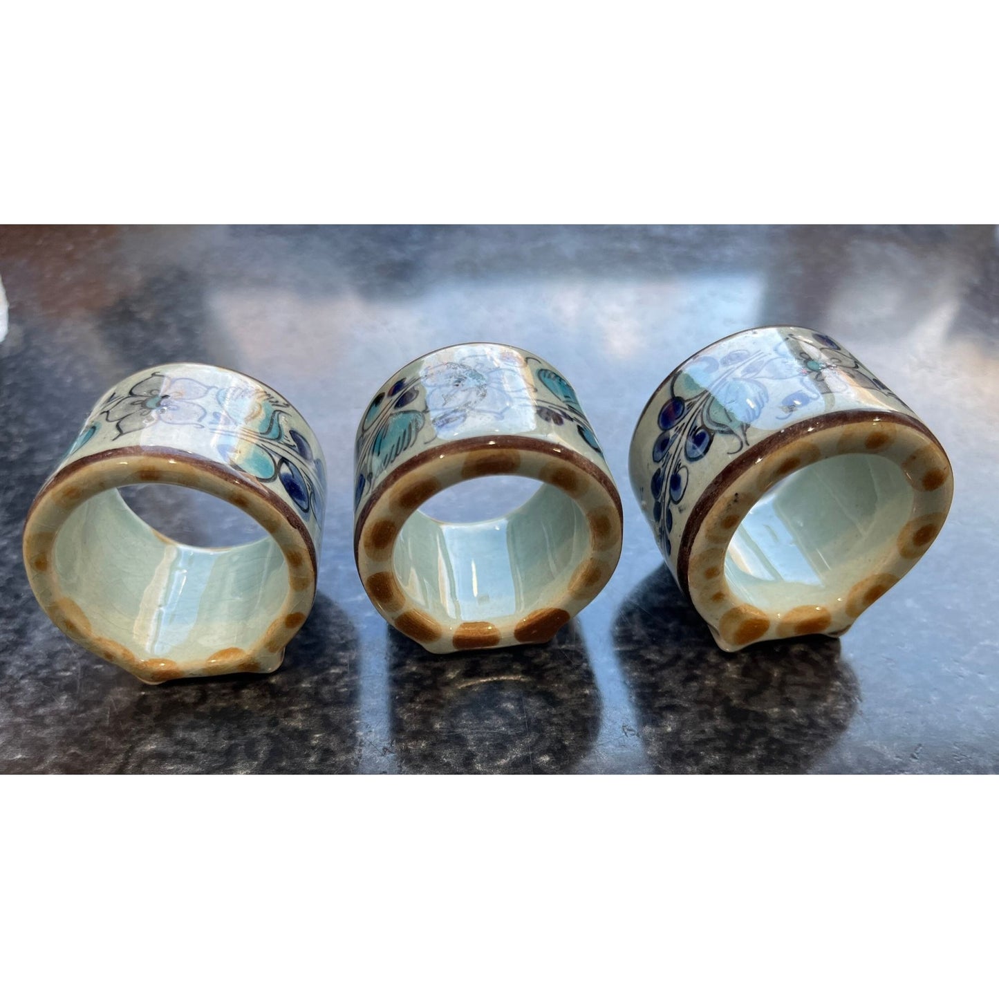 Vtg Three 15 CAT MEX Mexico Ceramic Handmade Napkin Rings 347 Meant To Stand Up Intricate Floral Design Blues Gray Brown